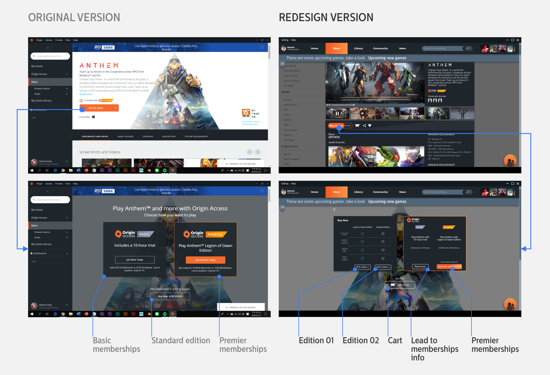 The navigation bar will be the thing that not only tells the user where can they go, but tell them what Origin also have. Therefore I keep it simple and clear and bring the recent games shortcut which only located on the homepage in the original version, to show on the navbar. So the user can click the shortcut wherever the page they were located.